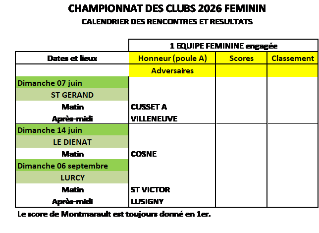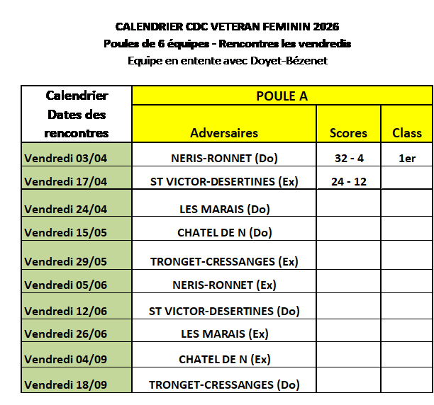 Nouveauté cette saison, il est créé un championnat pour les vétérans féminines en plus du CDC féminin normal. Le règlement pour ces CDC est le même que pour les autres CDC hormis la possibilité pour le CDC vétérantes de s’associer avec un autre club. Pour nous ce sera le club de Doyet-Bézenet et ce championnat se jouera les vendredis après-midi par poule de 6 équipes (2 poules cette saison) Nous avons engagé une équipe dans ces deux compétitions. Le calendrier pour les vétérans est désormais connu (voir ci-dessous), pour les autres pas encore. La composition de ces deux équipes est la suivante : |