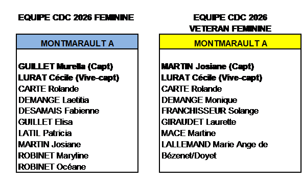 Nouveauté cette saison, il est créé un championnat pour les vétérantes en plus du CDC féminin normal. Le règlement pour ces CDC est le même que pour les autres CDC hormis la possibilité pour le CDC vétérantes de s’associer avec un autre club. Pour nous ce sera le club de Bézenet/Doyet et ce championnat se jouera le vendredi après-midi. Nous avons engagé une équipe dans ces deux compétitions et attendons la suite (date, lieu, composition des poules, etc.). La composition de ces deus équipes est la suivante : |